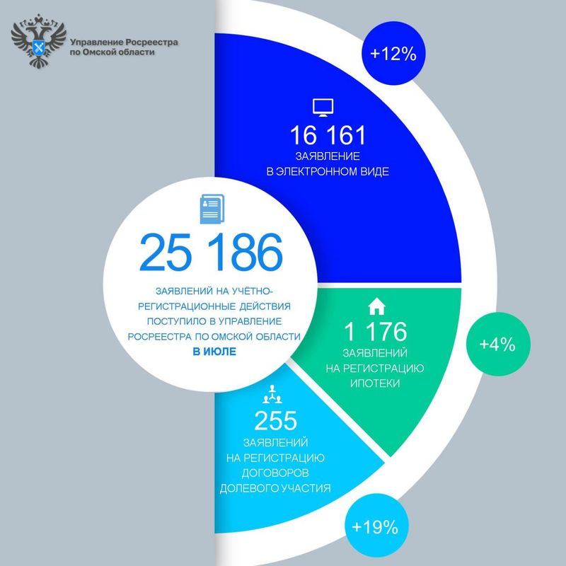 В июле в Управление Росреестра по Омской области от жителей региона поступило 25 186 заявлений на проведение учетно-регистрационных действий, что на 17 % больше, чем в июне (21 563), и на 56 % больше, чем в январе.