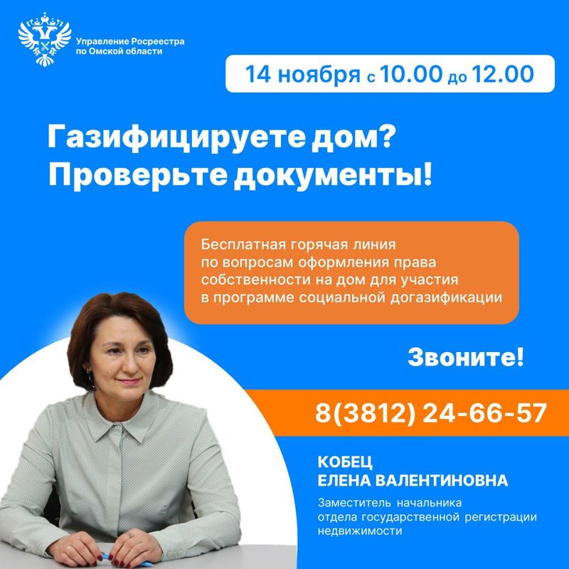 14 ноября с 10:00 до 12:00 в Управлении Росреестра по Омской области будет организована горячая линия по вопросам оформления объектов недвижимости, собственники которых намерены принять участие в программах социальной догазификации, действующих для населенных пунктов и садоводческих некоммерческих товариществ.